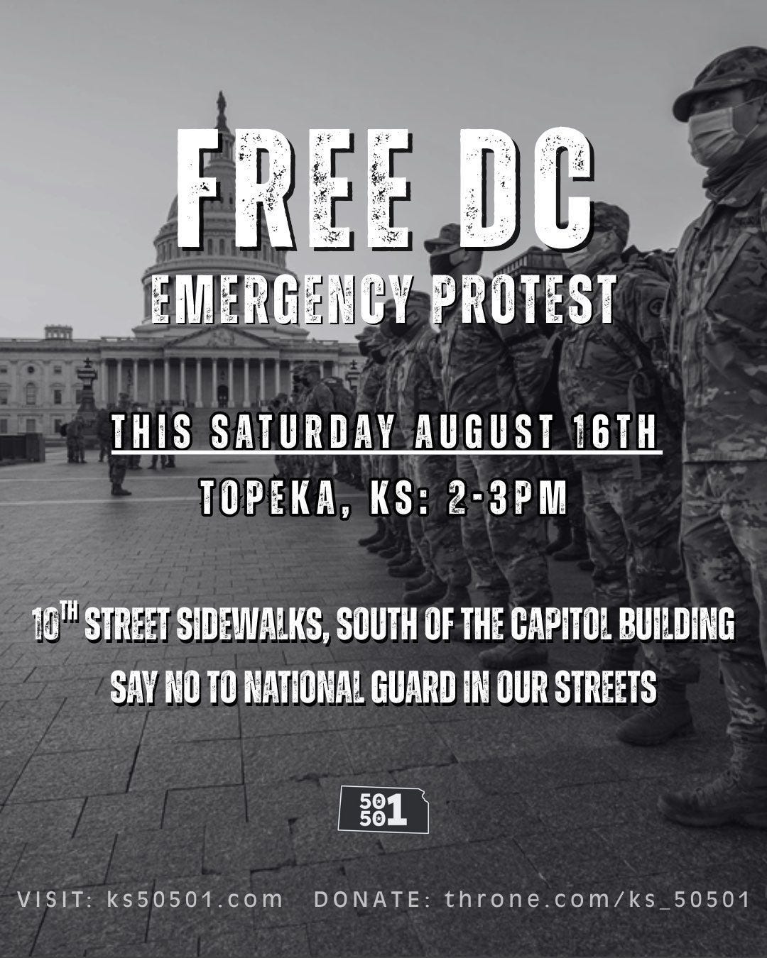 KS50501 has decided to host a Saturday, Aug 16, Rapid Response “Free DC” Sign-Waving protest on 10th Street SIDEWALKs, south of the Capitol.