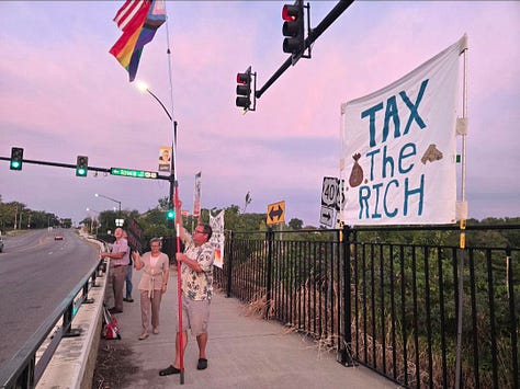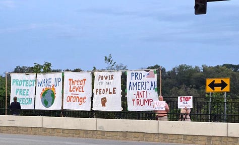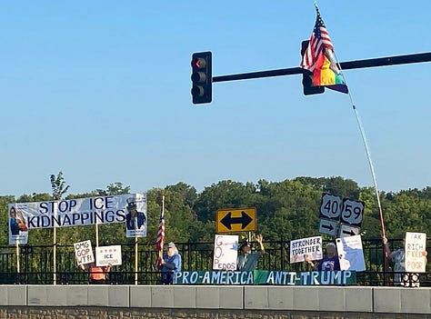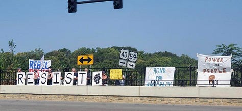 Lawrence Banner Brigade Resistance Group rallies to protect our Democracy! Shown here at the intersection of 6th and Iowa and bridge overpasses.