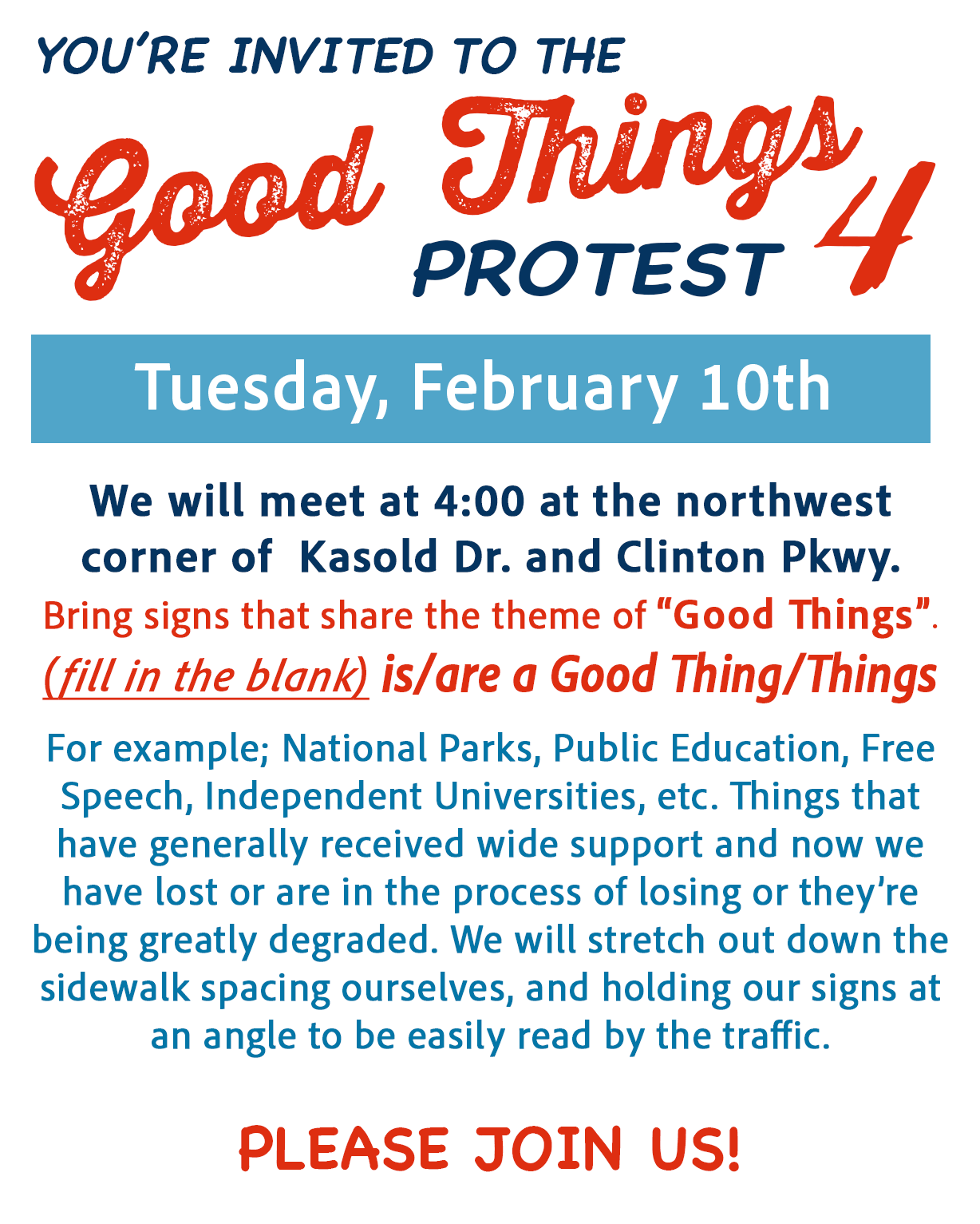 GOOD THINGS PROTEST #4, Feb. 10, 4-5pmAT CLINTON PARKWAY AND KASOLDFeb 04, 202651ShareShow our town folk that we all want the same “GOOD THINGS”!Thanks for reading! Subscribe for free to receive new posts.SubscribePreviousNext
