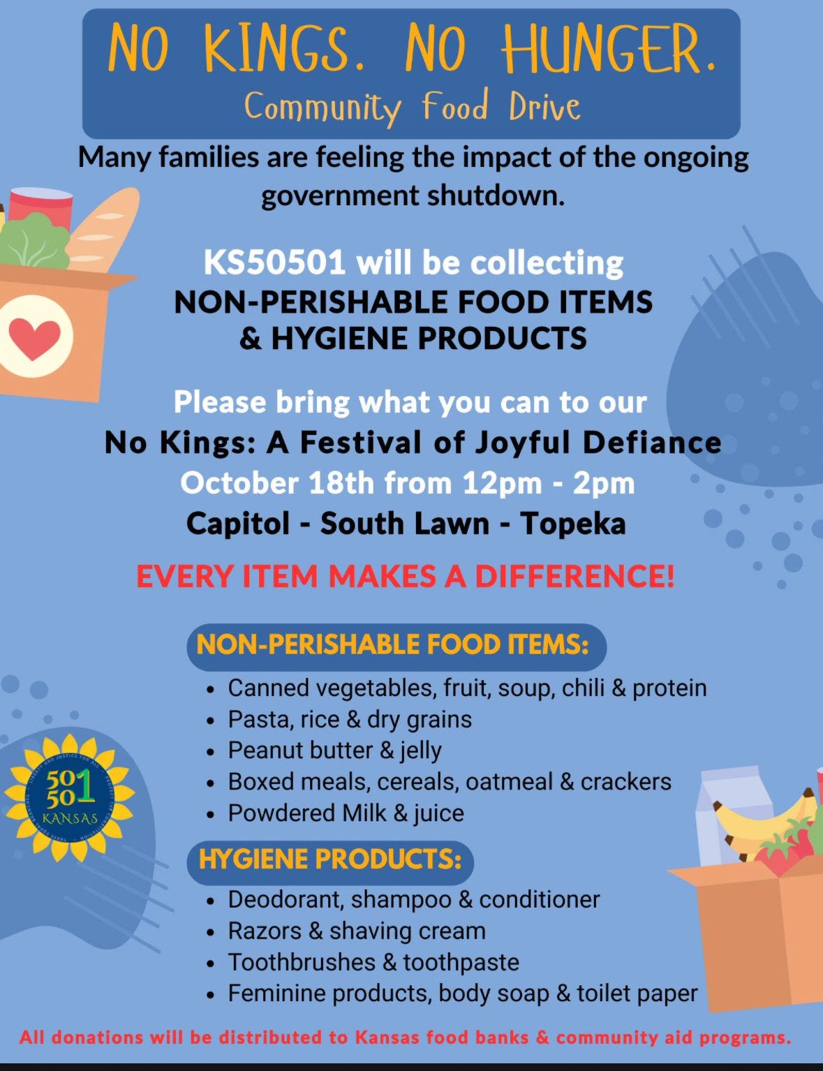 NO KINGS! Kansas 50501 Food DriveBring non-perishable food and other items for those affected by the shutdown.Oct 16, 202532ShareYour contributions will be collected from volunteers at the south end of the sidewalk going to the Capitol.Thanks for reading! Subscribe for free to receive new posts.SubscribePreviousNext