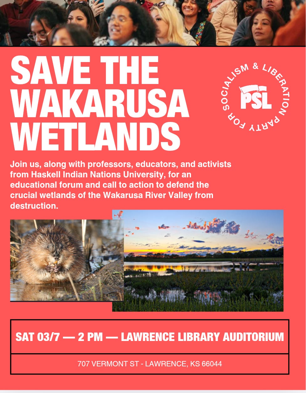 Please come to the gathering “Save the Wakarusa Wetlands” at 2 pm on March 7 at 707 Vermont St. in Lawrence, KS.