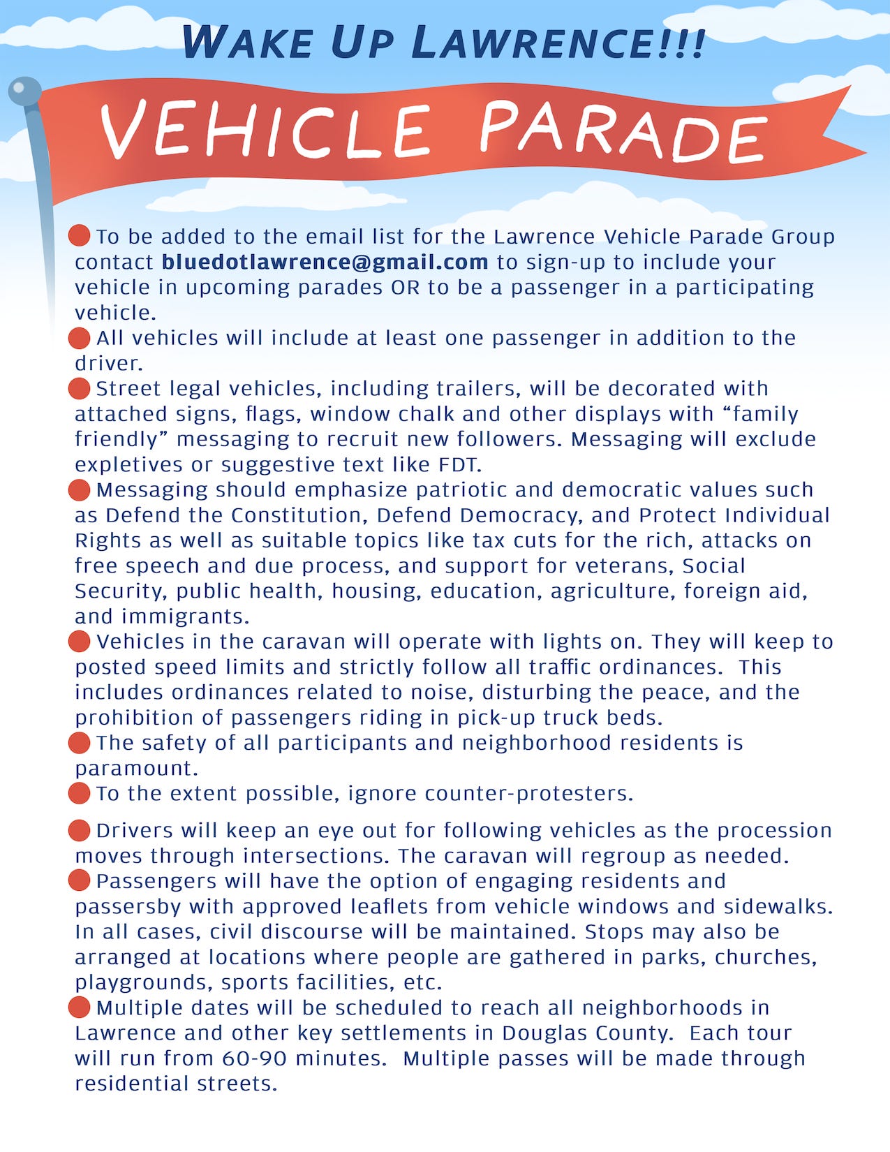 A group of us driving decorated cars will embark on a “Wake Up Lawrence” parade through North Lawrence on Monday at 7:00. If you live in the neighborhood bordered by 2nd street, Ash, 8th and Lyon you may see us. Come out and give us a wave!