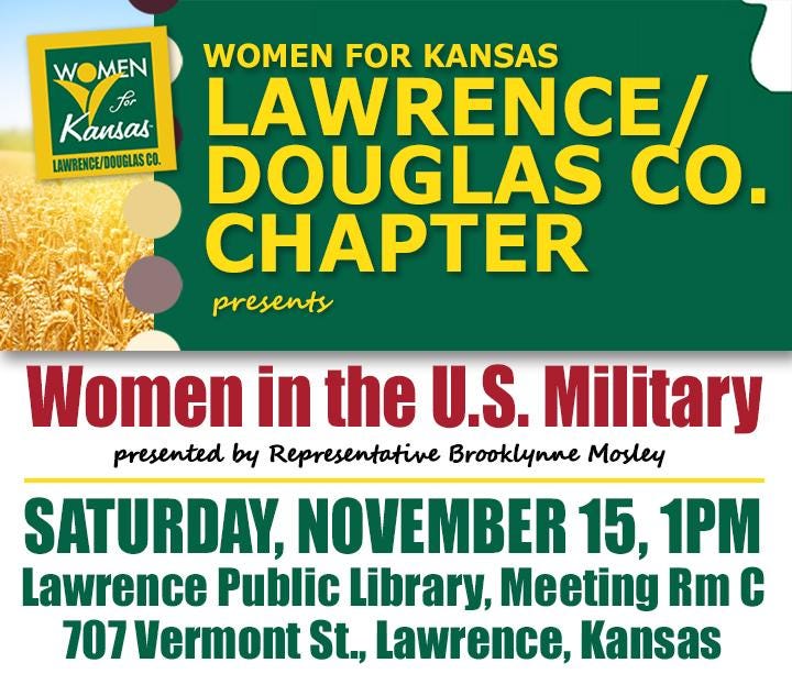 “Hope to see you at this program about the vital roles women have played in our U.S. Military! Sat., Nov. 15, 1:00pm in the Lawrence Public Library, downstairs in Mtg. Room C, featuring Rep. Brooklynne Mosley of Lawrence!”